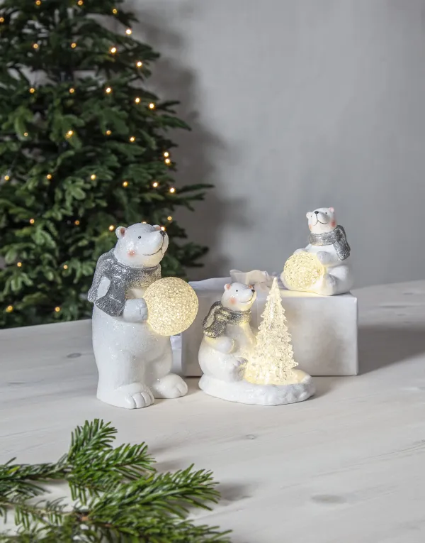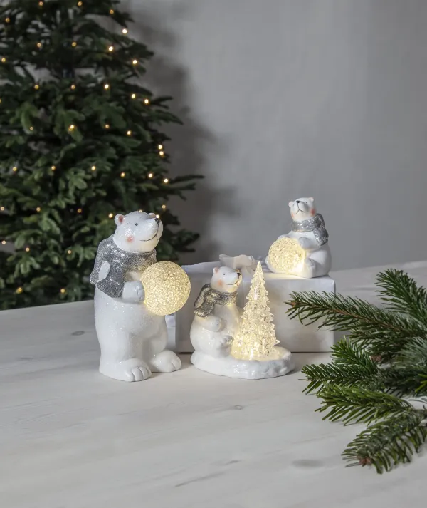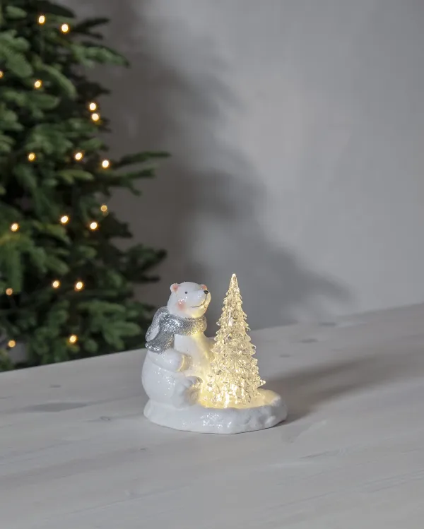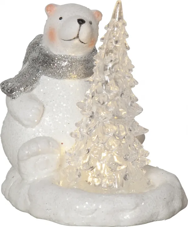 Dekoratīvs polārlācis ar egli, smuki mirdz eglē. Polārlācis ir balts ar sala sajūtu. Produktam ir taimera funkcija, un to darbina 2 AG13 / LR44 baterijas, kas ir iekļautas komplektācijā. Skaista dekorācija ziemai un Ziemassvētkiem. Izrotājiet bērnu istabu vai novietojiet to uz galda vai plaukta, lai radītu vislabāko Adventes un Ziemassvētku noskaņu.