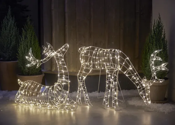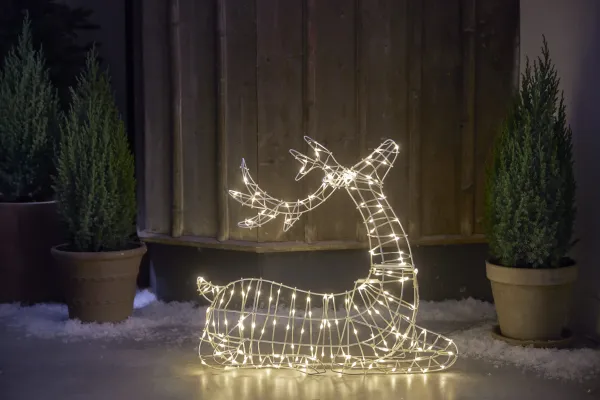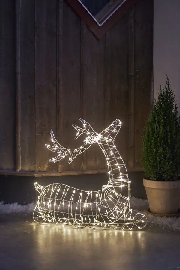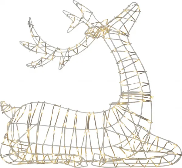 Ļoti jauks āra produkts jūsu dārzam vai terasei. Metāla rāmis, 64cm augsts un 92cm plats, balts briedis ar 160 silti baltām LED gaismām. IP44 adapteris ar 5 m caurspīdīgu vadu.