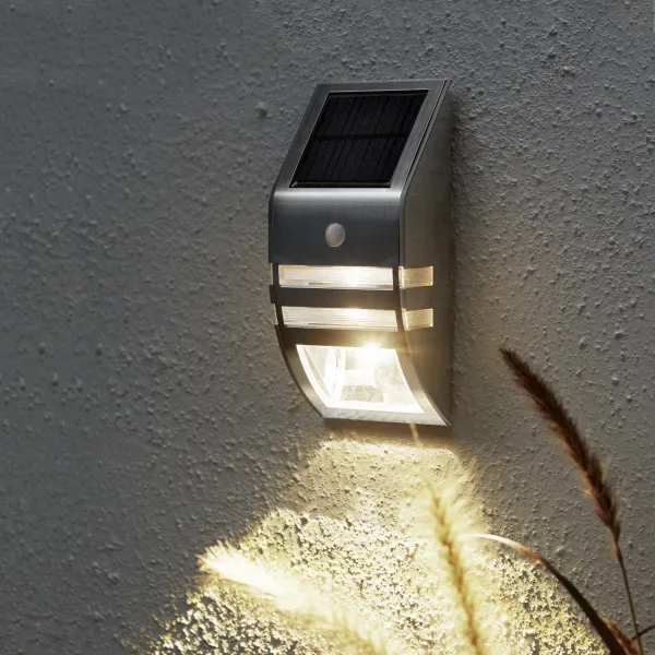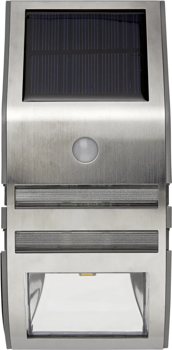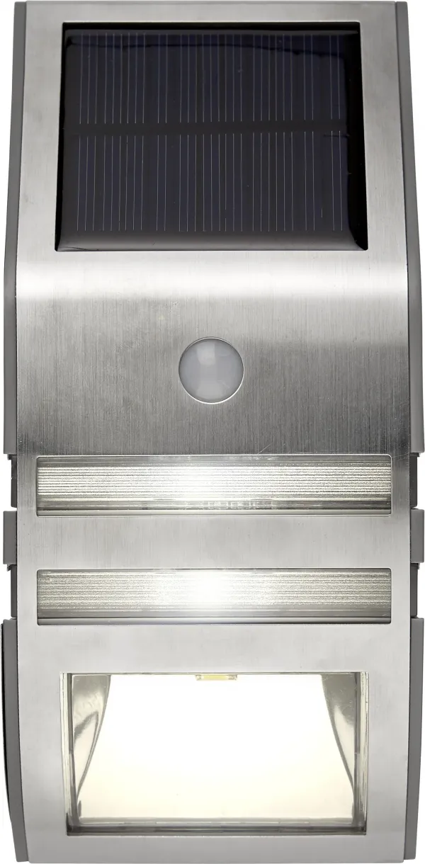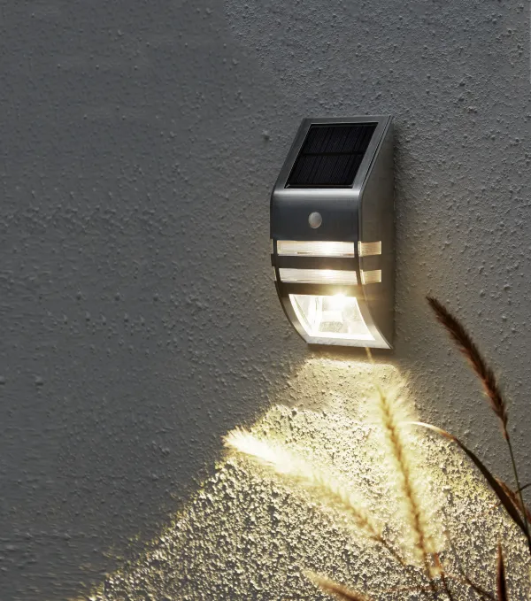 Wall light with 50Lm in 45 seconds, then down to 2Lm until motion sensor will get indication again, this during night time. In sunlight, the solar panel charges the rechargeable battery.