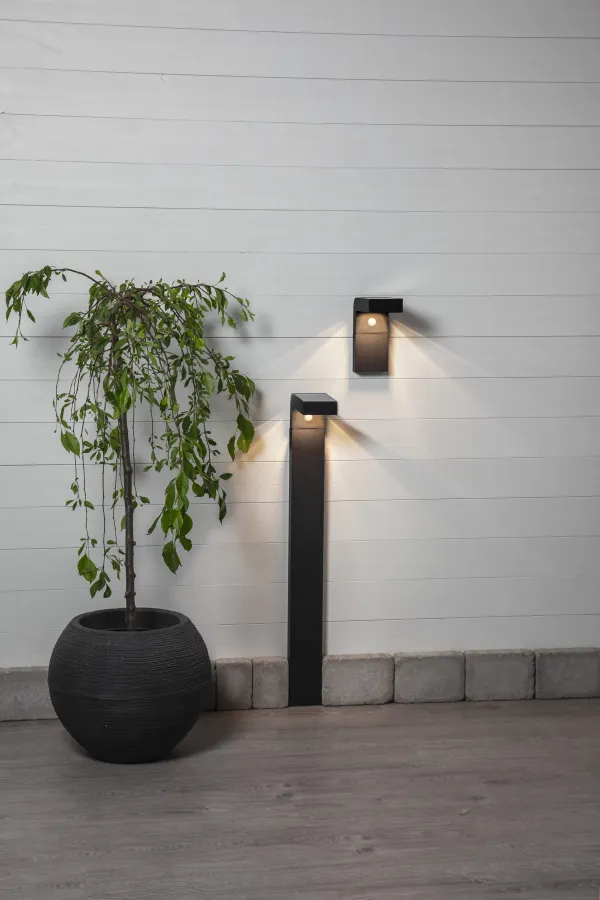 Solar wall-light that during night time and by movement sensor lights up with 300 Lumen in 25 seconds, then down to 30 Lumen constant light.