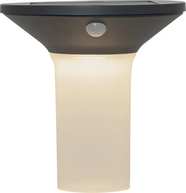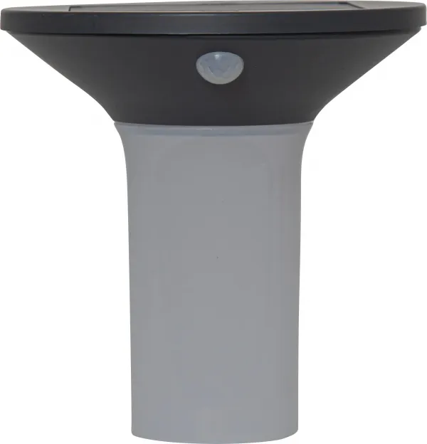 Solar wall-light that during night time and by movement sensor lights up with 400 Lumen in 30 seconds, then down to 15 Lumen constant light. NOTE to switch on the product, keep the On-Off button pressed for a few seconds and cover the panel at the same time!