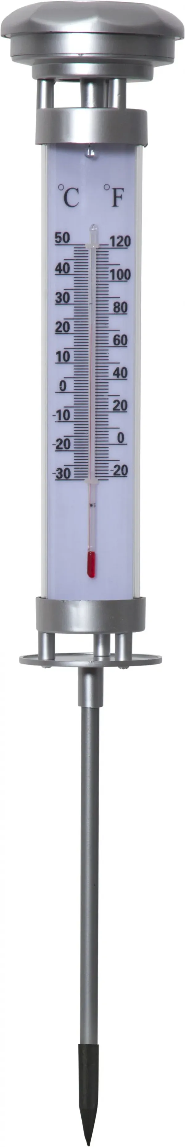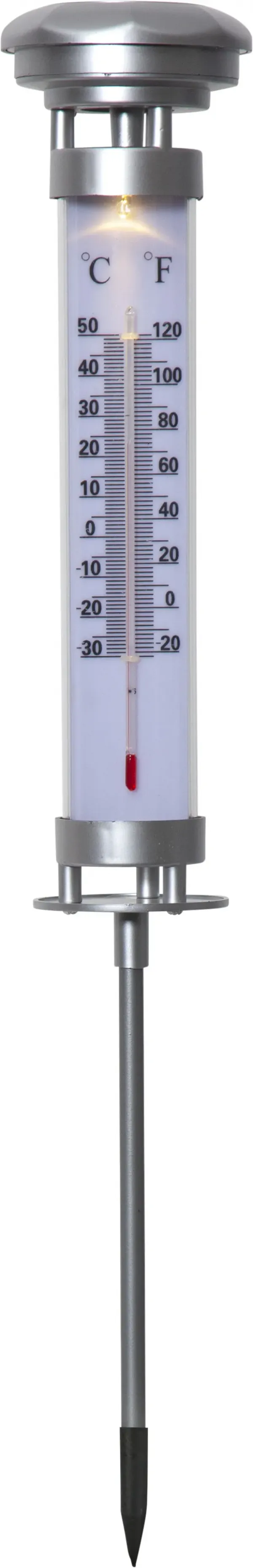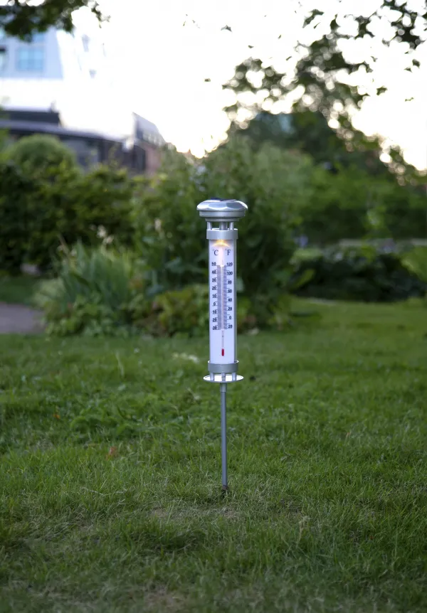 Thermometer with built in light in warm-white that shines during the night time. The thermometer have both Celsius and Fahrenheit scale.