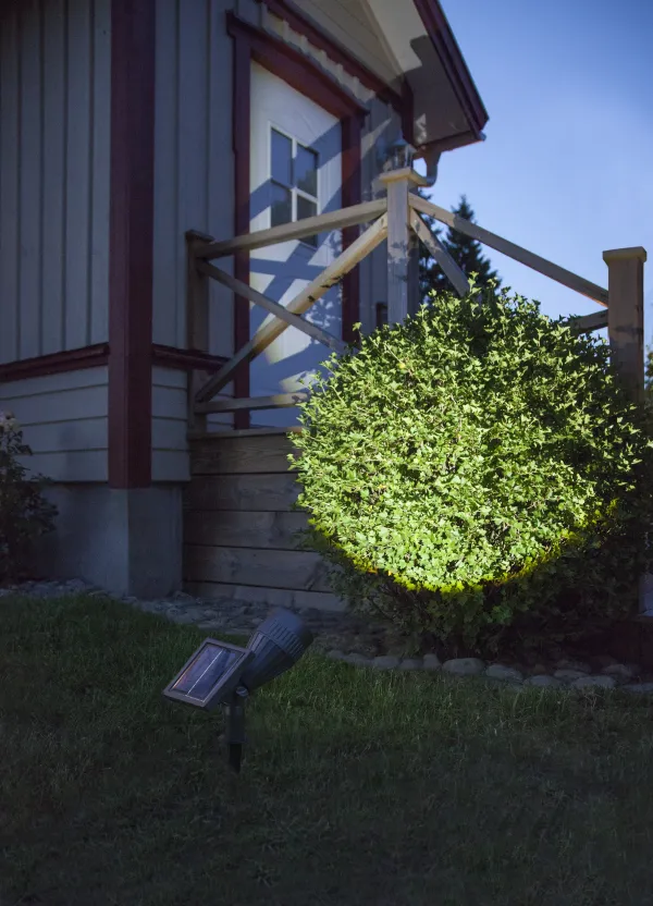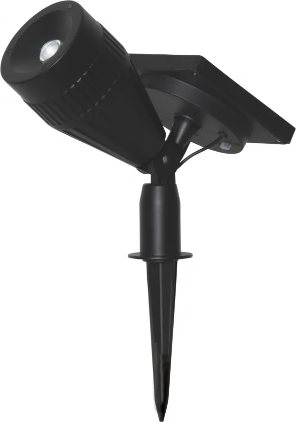 Solar spotlight, that lights up with 60 lumen constant for approximate 5 hours during the night. With adjustable beam angle.