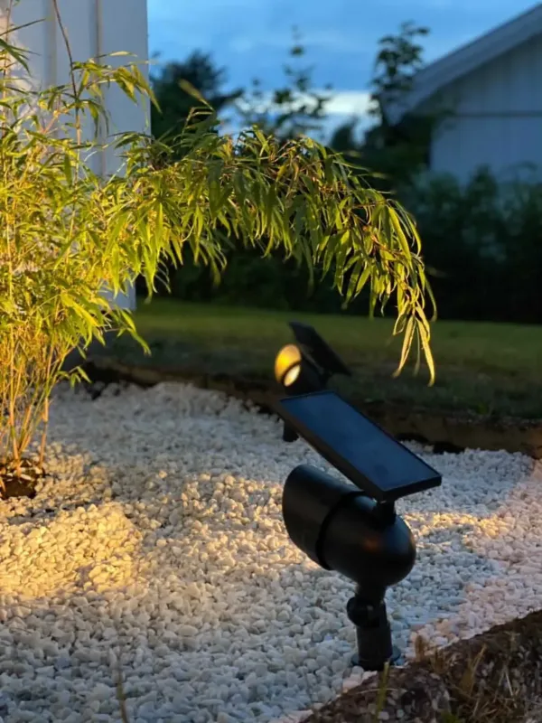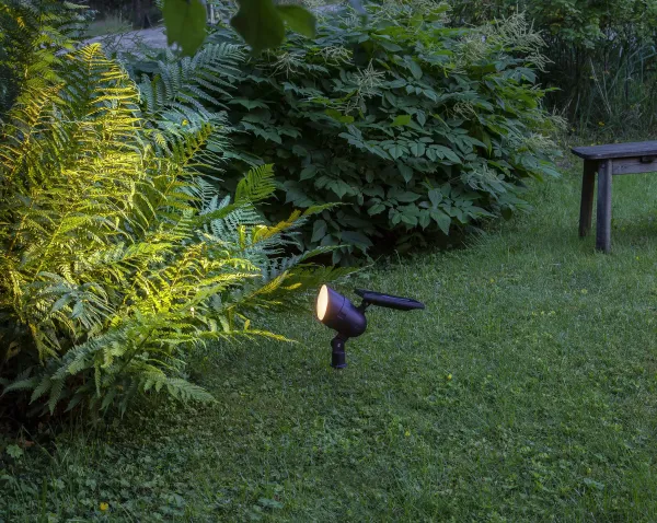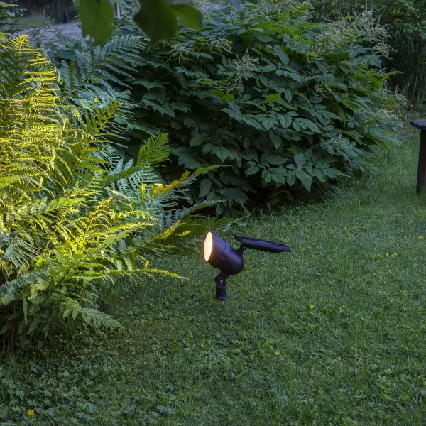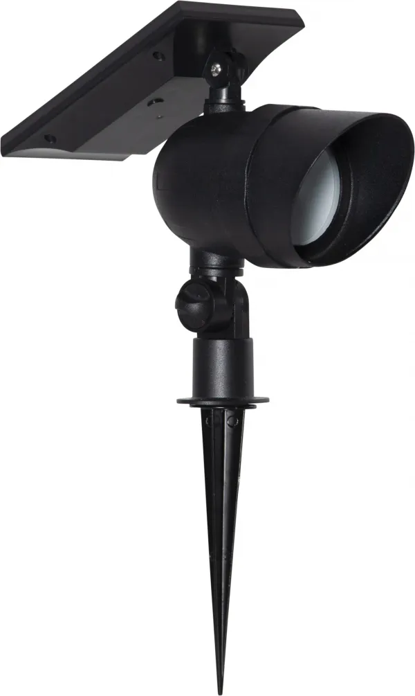 Solar-powered spotlight in cast aluminum, gives a good shine with 120 Lumen in the dark.