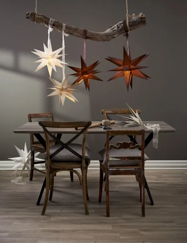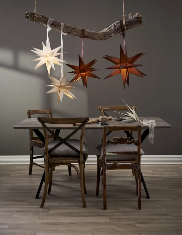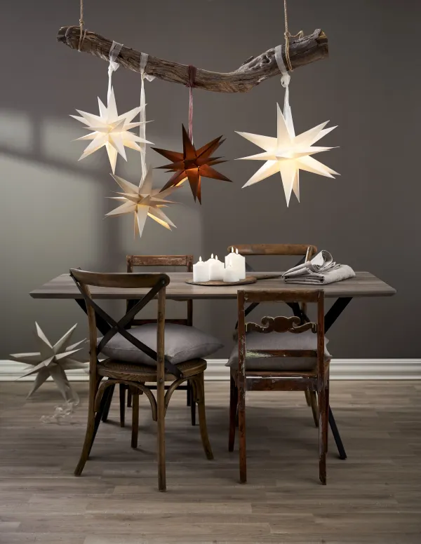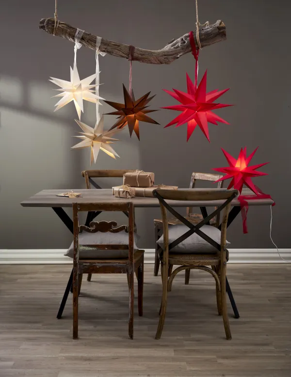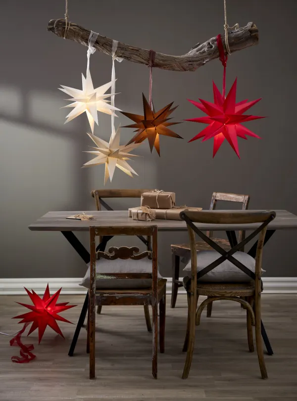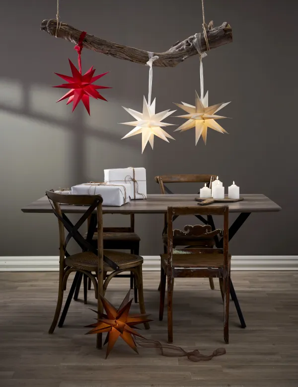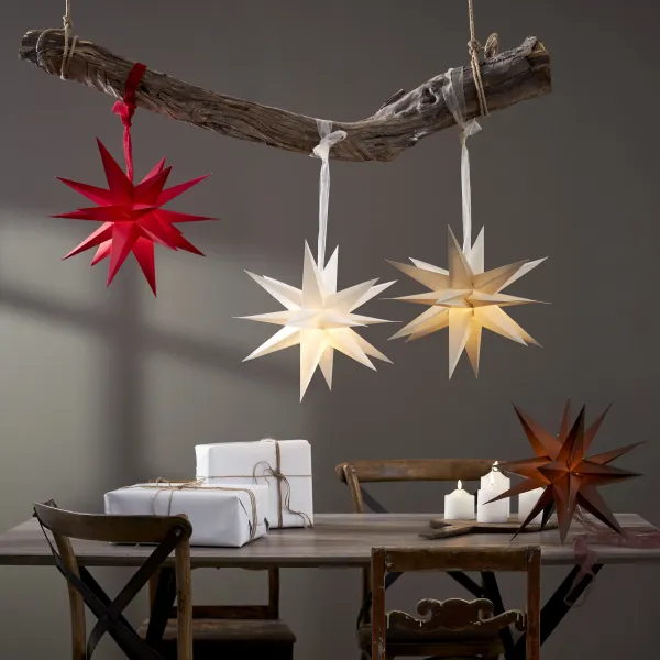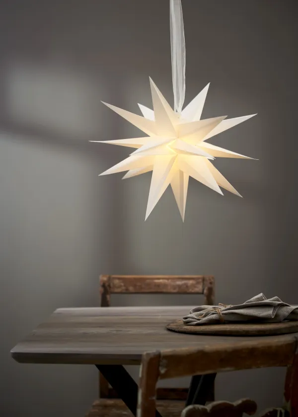 White paper star 35cm with 18 arms wihch is a fantastic Christmas decoration over a table, one or more together. This size also fits well in a window. Easily assembled using the drawstring and decorative strap. Christmas will be something really special with December as a decoration. Add cord set and light source to light up the star, not included.