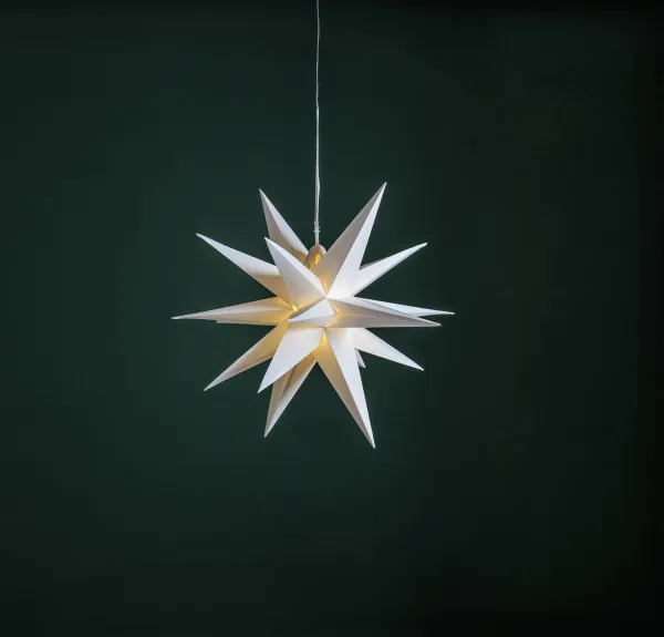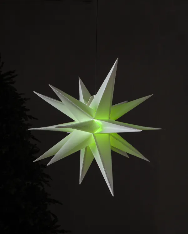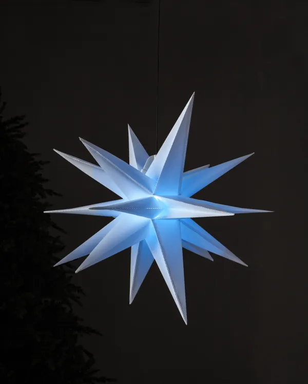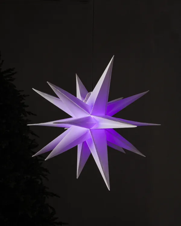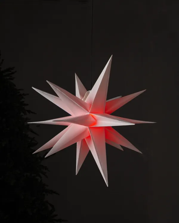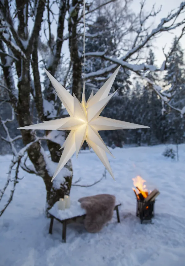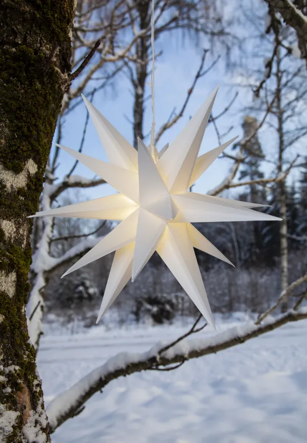 Battery operated 3D star for outdoor use. The star has 12 LED light sources with warm white light. The built-in timer makes it easy to set when the decoration should be lit.