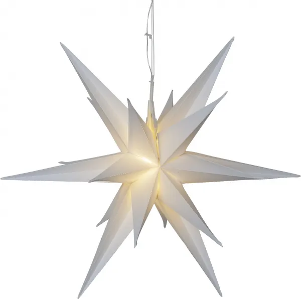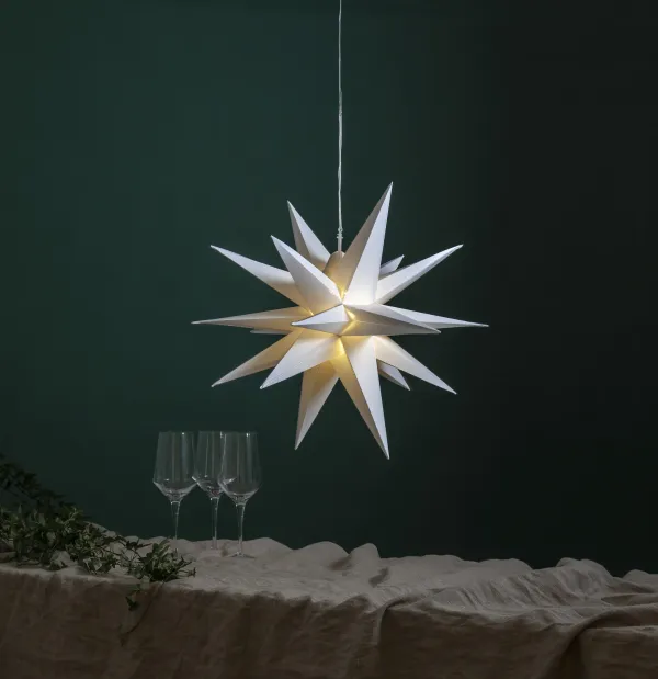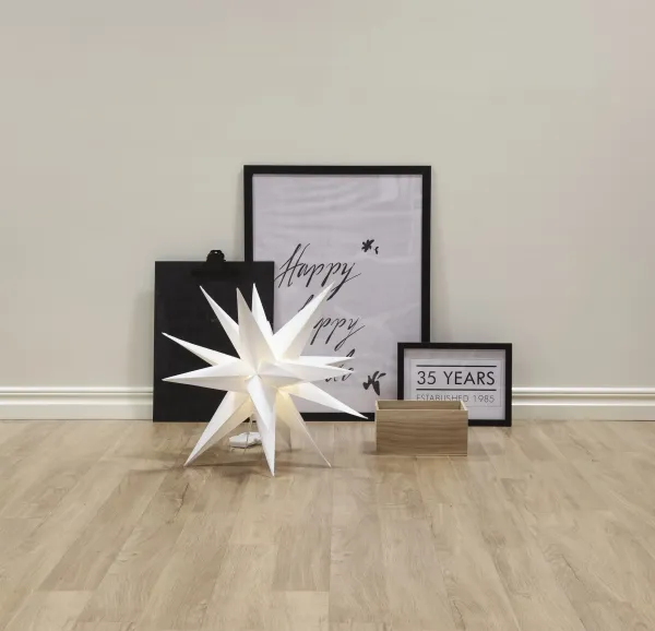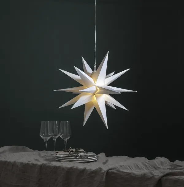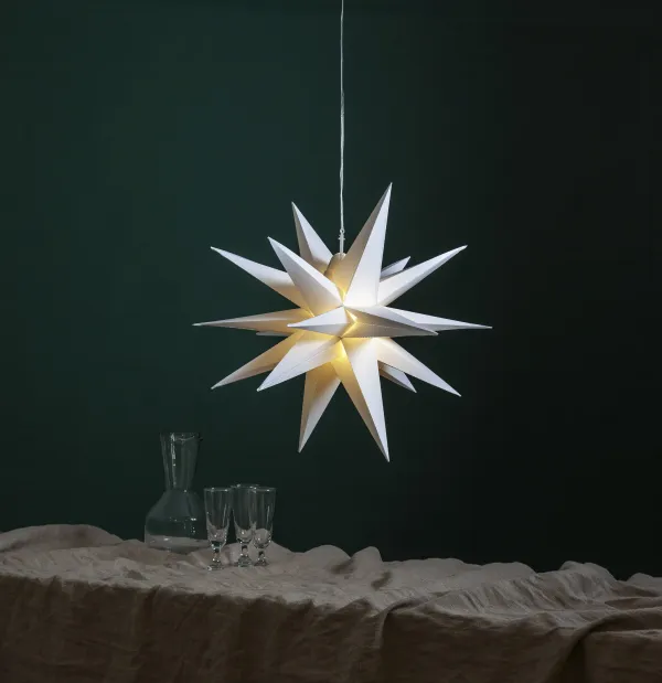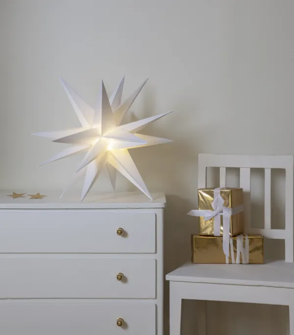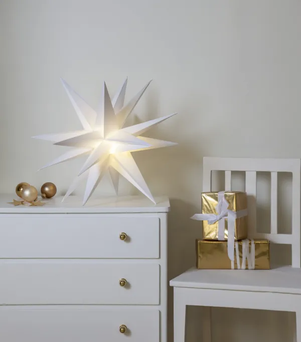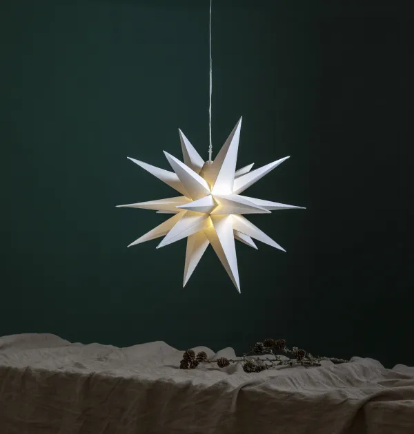 Battery operated 3D star for outdoor use. The star has 12 LED light sources with warm white light. The built-in timer makes it easy to set when the decoration should be lit.