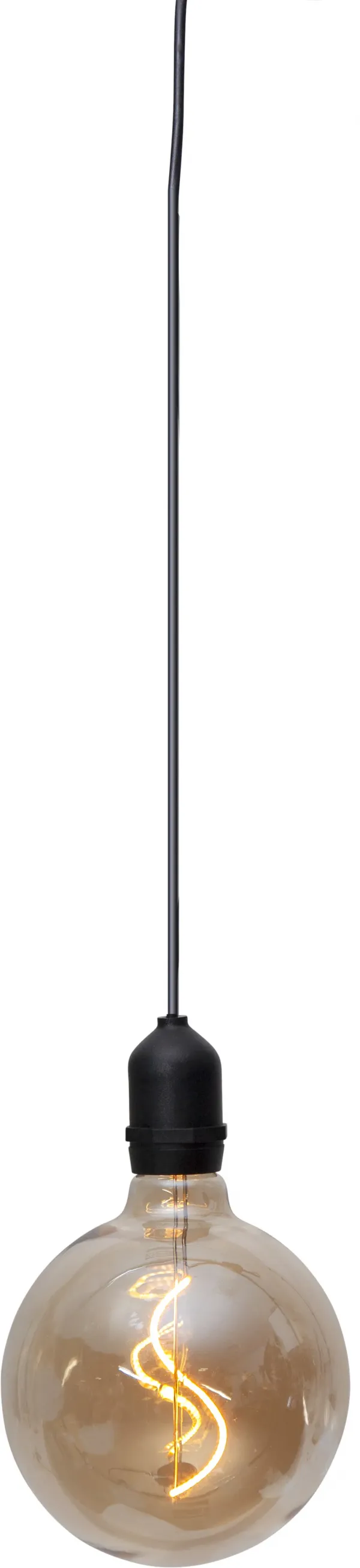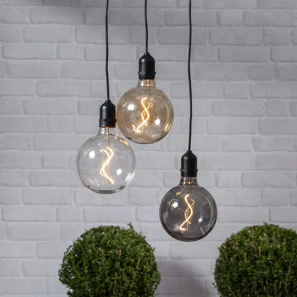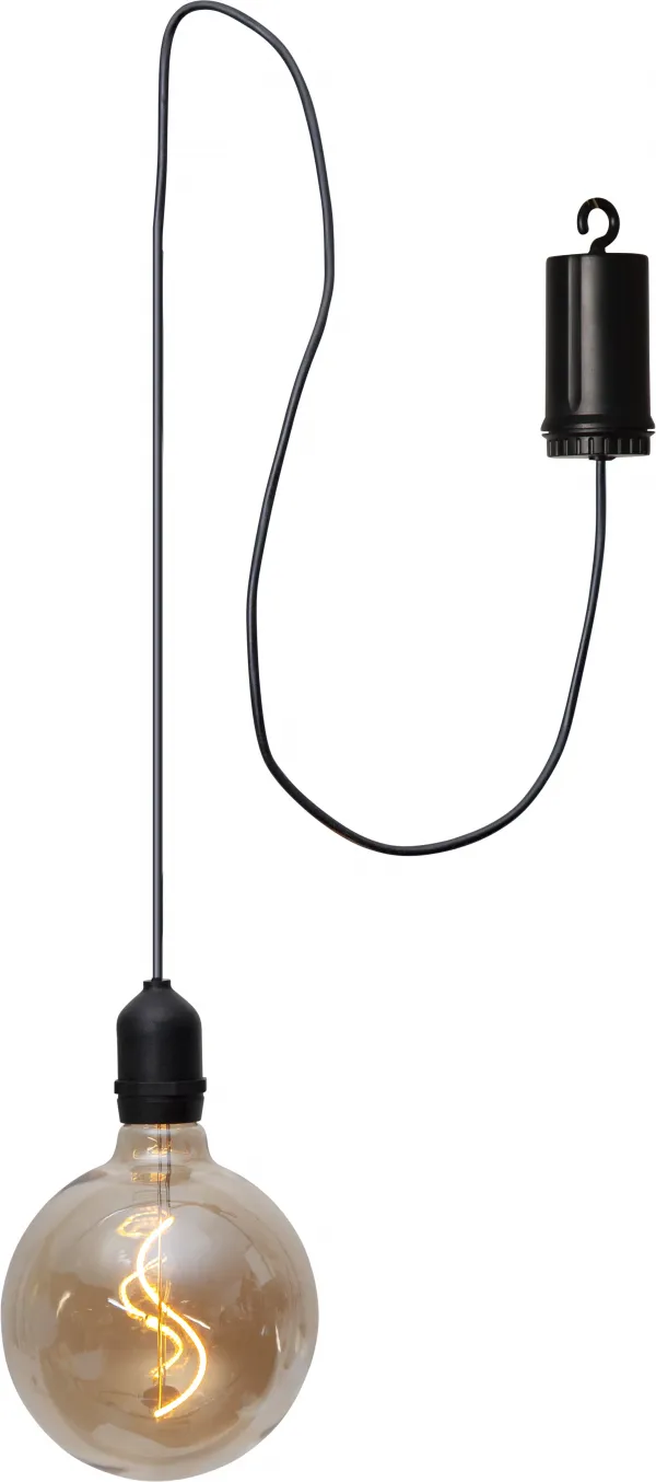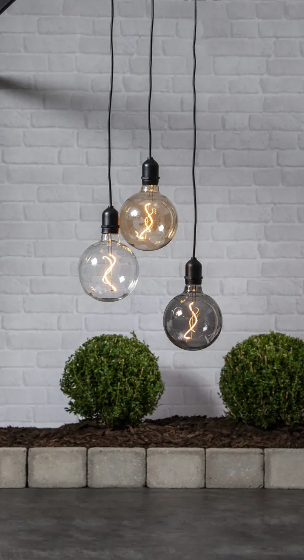 Stylish glass ball for outdoor decoration, amber coloured glass with filament LED. Battery operated with timer function.