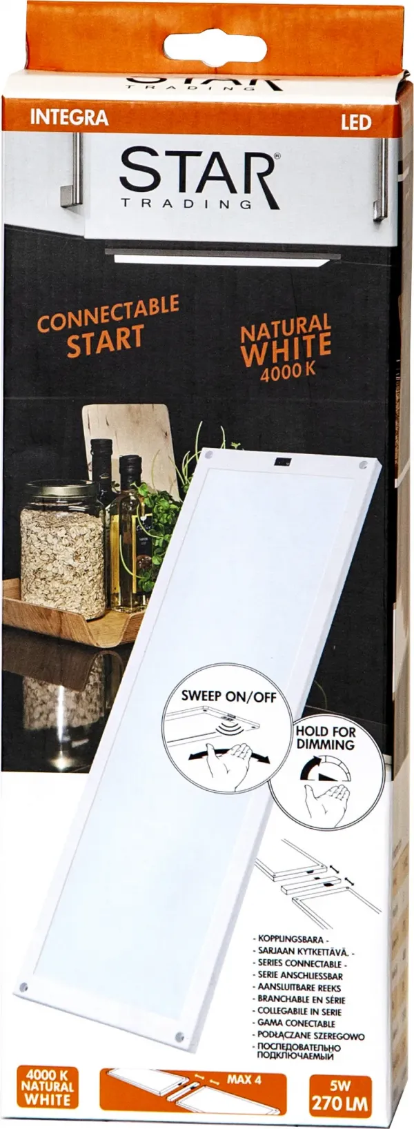 Connectable slim LED panel. On/Off and diming by using hand. Easy installation with 3M tape, magnet or screws. Natural white light, suitable for working places. This unit is the start unit.