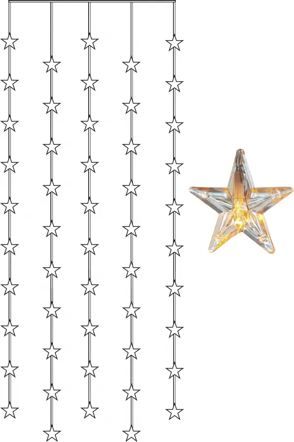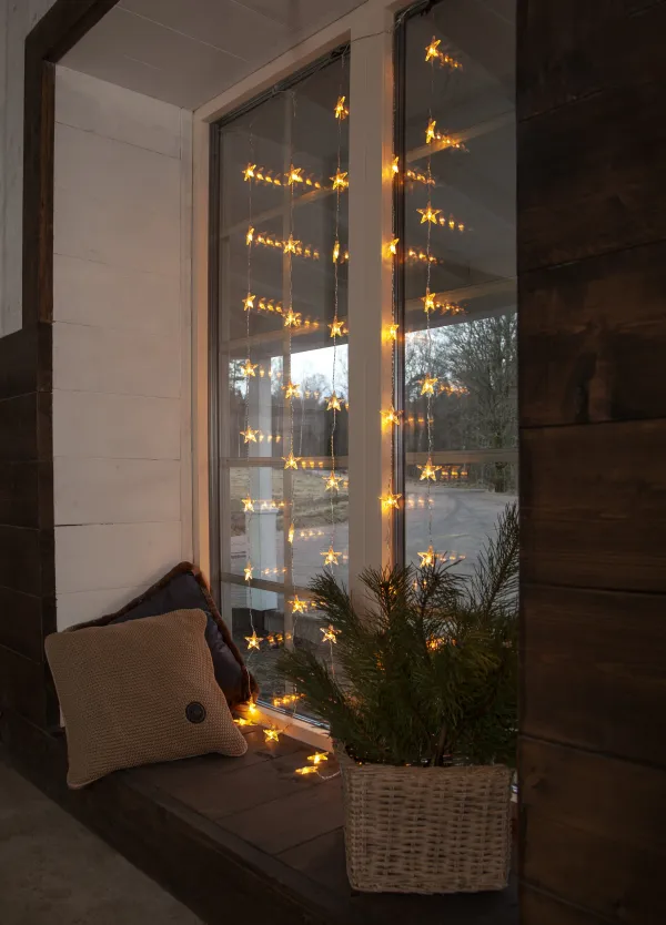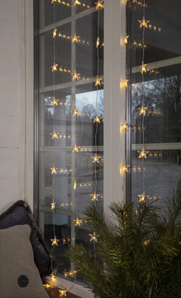 Transparent Star Curtain with warm white shine for indoor use. Place the curtain in the window as a beautiful decoration with light. The Star Curtain has 50 LED-Light sources.