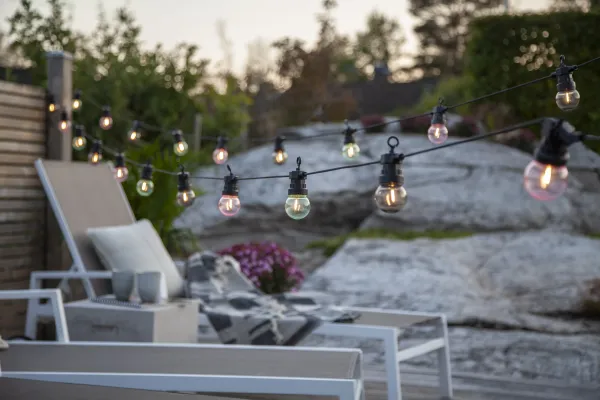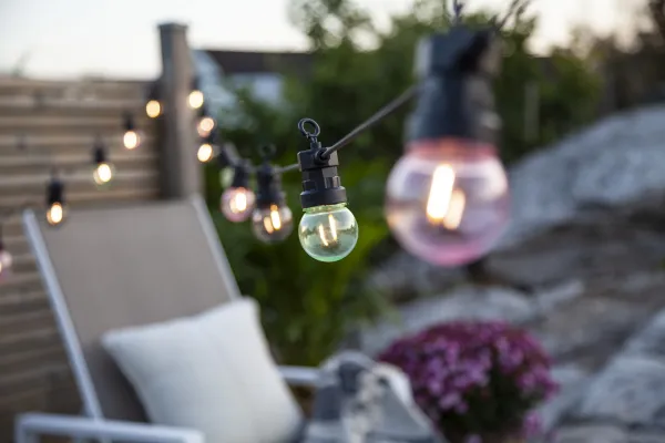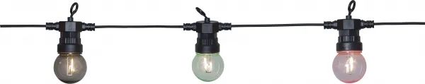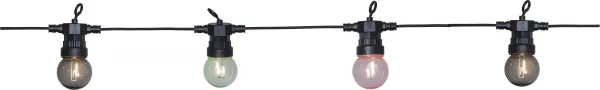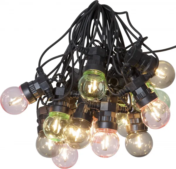 Party light with transparent coloured covers and 20 pcs LED lights with filament. Lovely light chain to decorate with for party and everyday. Creates a beautiful light in the dark. the cable is black and the covers has a hook to easily hang up the light chain